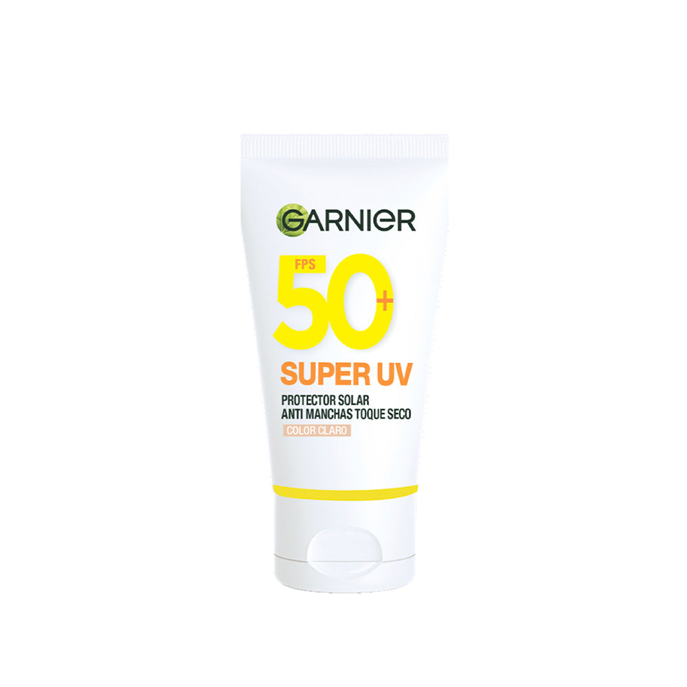 Protector Solar Garnier Super UV Toque Seco con color, brinda una doble acción para tu piel mientras protege del sol gracias al FPS 50+, te aporta luminosidad gracias a la vitamina C que actúa como antioxidante y combate las manchas causadas por el sol. Te ofrece una protección solar de amplio espectro contra los rayos UVB / UVA. Con textura ligera y efecto mate, apto para todo tipo de piel, uniformiza al instante. Además, tiene fórmula vegana y es un producto aprobado por Cruelty Free.