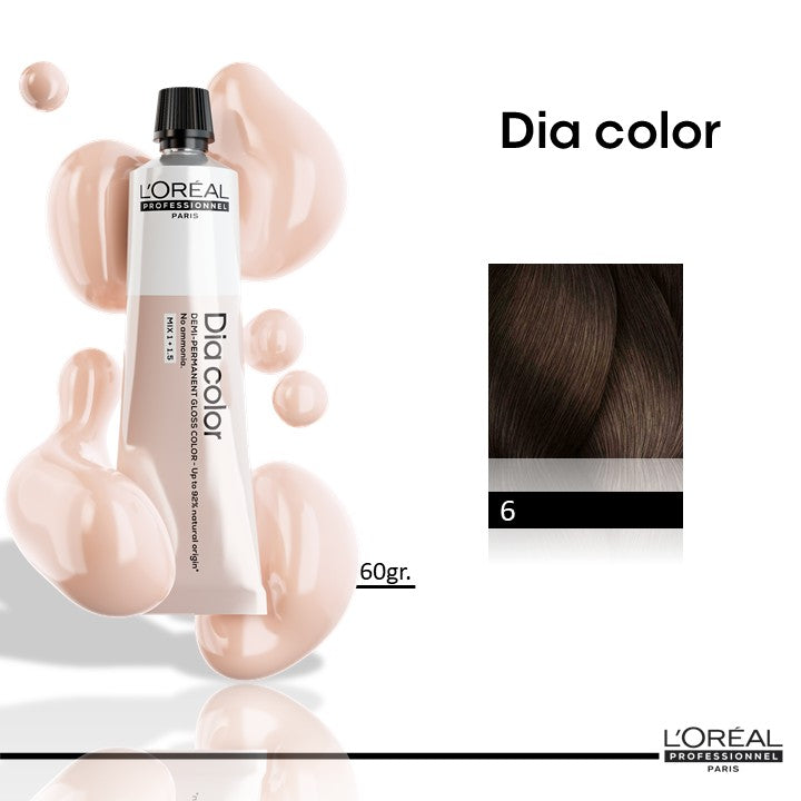 Dia color es una coloración alcalina demi-permanente sin amoniaco para conseguir un color gloss. Revierte los efectos de la pérdida de melanina durante 6 semanas de color gloss* y cubre hasta un 70% de los cabellos blancos. Proporciona x3 más brillo** y reaviva el color del cabello. La textura es en crema para facilitar la mezcla, aplicación y enjuague. Dia color restaura el color y brillo con la tecnología de relleno de la melanina perdida, que replica el color de la melanina y rellena los huecos de melanina perdida. Su fórmula contiene hasta 92% de ingredientes de origen natural***.