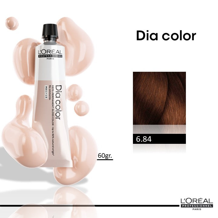 Dia color es una coloración alcalina demi-permanente sin amoniaco para conseguir un color gloss. Revierte los efectos de la pérdida de melanina durante 6 semanas de color gloss* y cubre hasta un 70% de los cabellos blancos. Proporciona x3 más brillo** y reaviva el color del cabello. La textura es en crema para facilitar la mezcla, aplicación y enjuague. Dia color restaura el color y brillo con la tecnología de relleno de la melanina perdida, que replica el color de la melanina y rellena los huecos de melanina perdida. Su fórmula contiene hasta 92% de ingredientes de origen natural***.