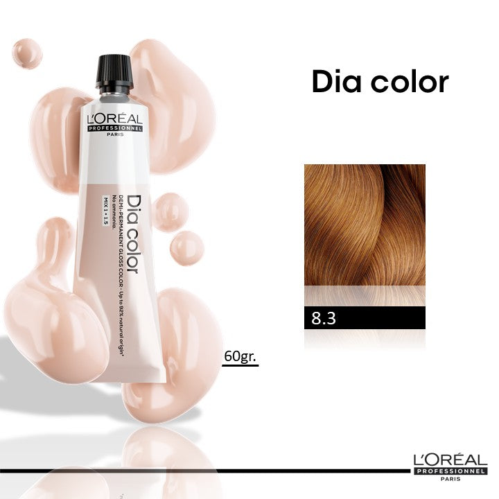 Dia color es una coloración alcalina demi-permanente sin amoniaco para conseguir un color gloss. Revierte los efectos de la pérdida de melanina durante 6 semanas de color gloss* y cubre hasta un 70% de los cabellos blancos. Proporciona x3 más brillo** y reaviva el color del cabello. La textura es en crema para facilitar la mezcla, aplicación y enjuague. Dia color restaura el color y brillo con la tecnología de relleno de la melanina perdida, que replica el color de la melanina y rellena los huecos de melanina perdida. Su fórmula contiene hasta 92% de ingredientes de origen natural***.