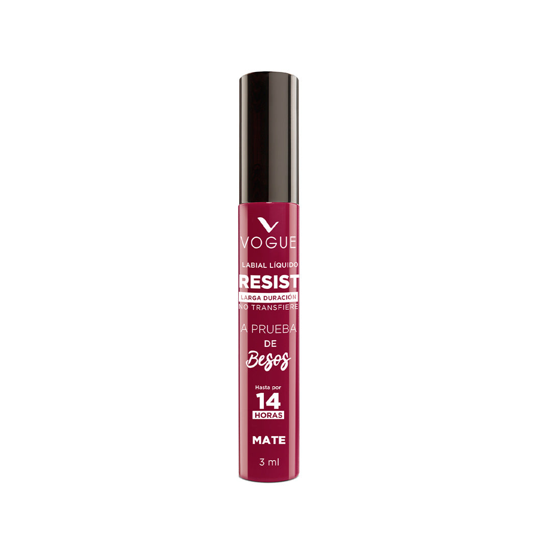 Descubre el labial liquido Resist a prueba de besos, un producto que brinda un acabado 100% mate, duración de hasta 14 horas que no transfiere con una fácil aplicación que brinda color intenso.